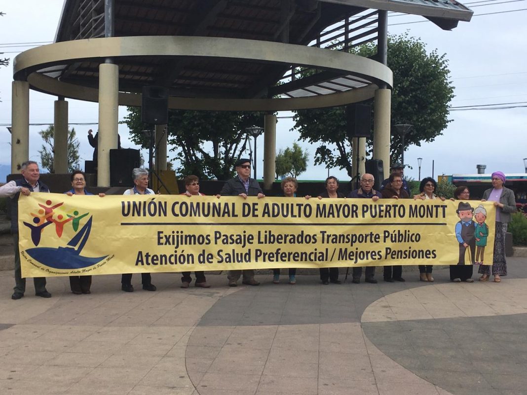 La Unión Comunal de Adultos Mayores de Puerto Montt, realizó una protesta pacífica en la Plaza de Armas de Puerto Montt, ocasión donde desplegaron un lienzo con tres peticiones principales orientadas a las mejoras en atenciones de salud, previsión y la rebaja de pasajes en el transporte público, comentó, Fabiola Oyarzún, Presidenta la Unión Comunal de Adultos Mayores.