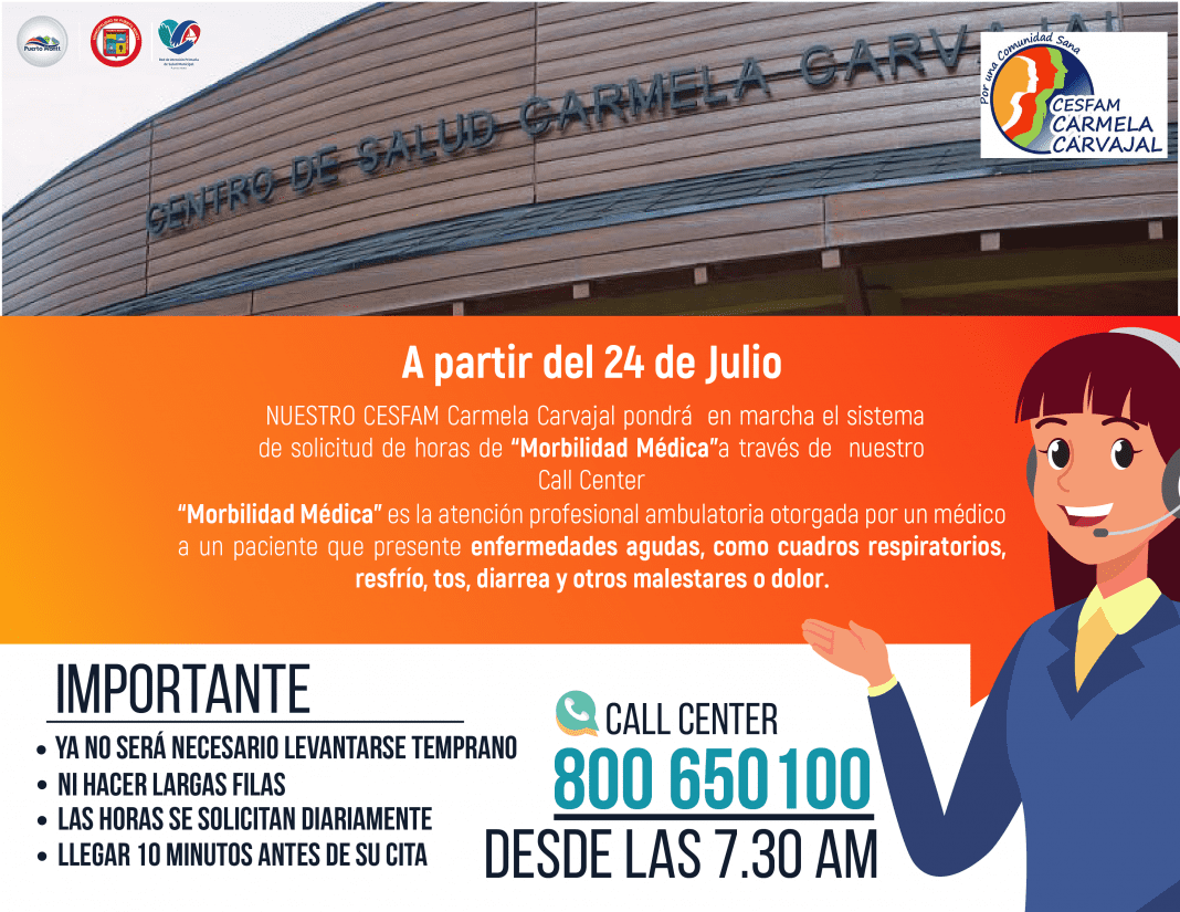 A partir del 24 de julio en el Cesfam de Antonio Varas y Carmela Carvajal de Puerto Montt, se pondrá en marcha la entrega de horas médicas a través del Call Center 800 650 100, con lo que se busca disminuir las solicitudes presenciales y evitar con ello que la comunidad concurra a los establecimientos de la Red de Salud Primaria, sobre todo en temporada invernal, donde las inclemencias más afectan a las personas.
