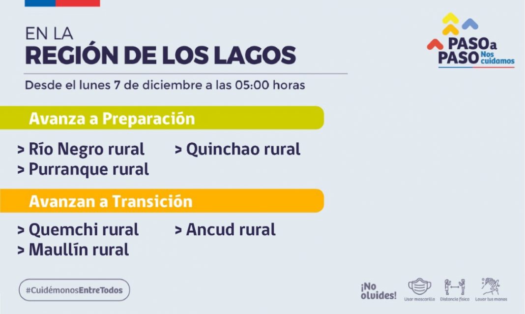 El Jefe Regional informó que desde el lunes 7 de diciembre Río Negro, Purranque y Quinchao que están en fase 2, sus sectores rurales van a quedar en fase 3, “es decir, la fase 2 solo afecta a los sectores urbanos; para Ancud, Maullín y Quenchi que están en fase 1, todo el sector rural queda en fase 2, es decir, solo cuarentena de fines de semana”.