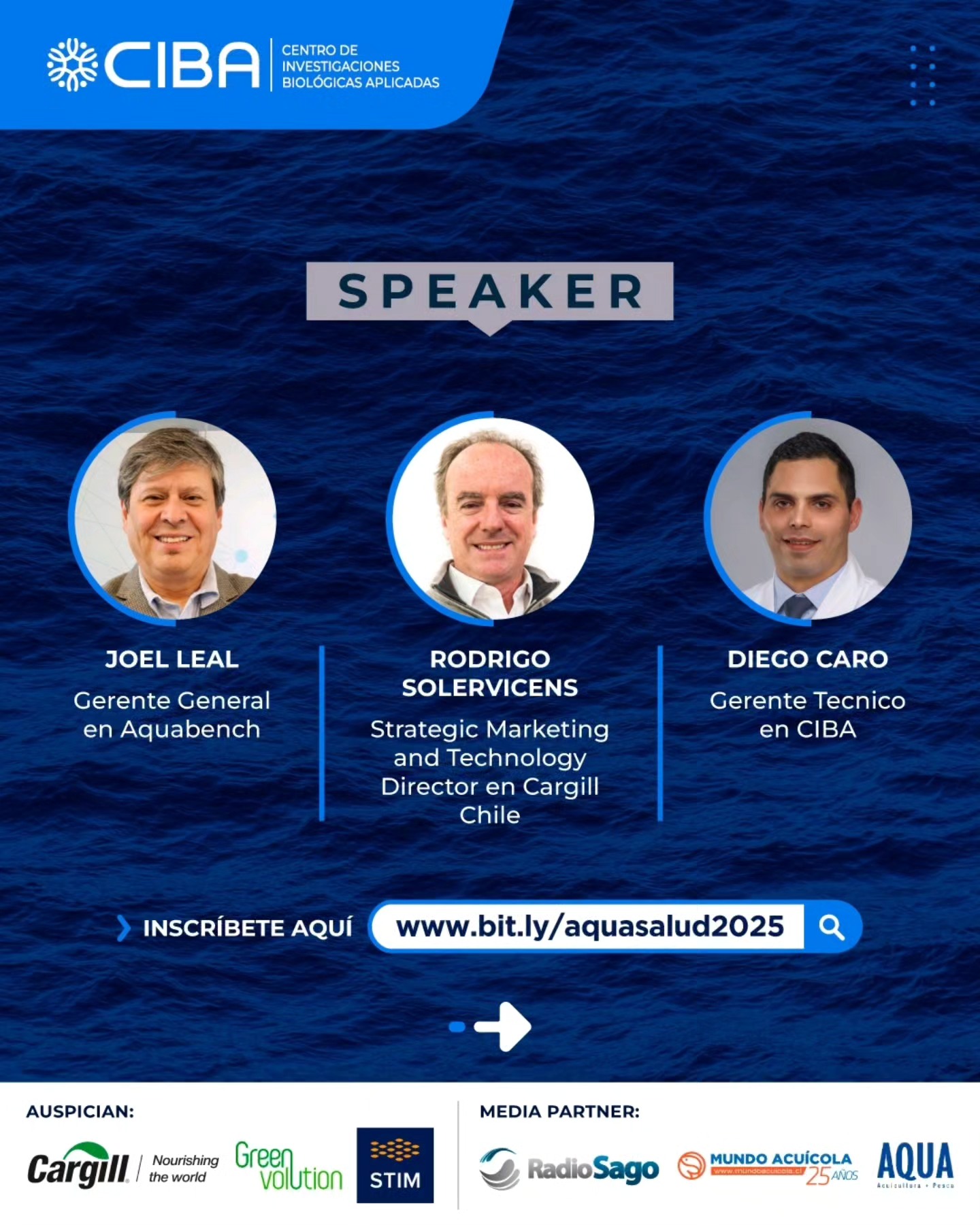 El tradicional evento académico y científico que organiza el Centro de Investigaciones Biológicas Aplicadas (CIBA) ya tiene a todos sus speaker o relatores confirmados para el próximo 28 de octubre, jornada en la que se llevará acabo AquaSalud 2025, que este año abordará la nutrición y salud en salmónidos.