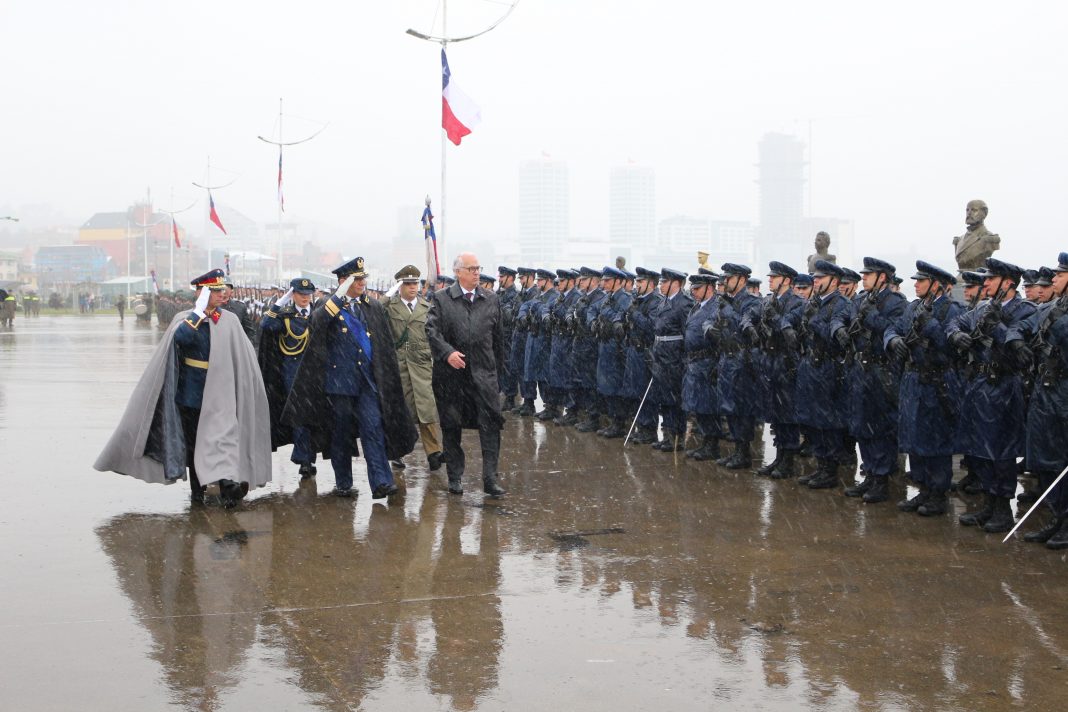 Luego las autoridades se trasladaron hasta el Campo de Marte en la costanera de Puerto Montt, donde bajo las intensas precipitaciones esperaban las tropas de las Fuerzas Armadas y de Orden para dar curso el desfile cívico militar en honor a las Glorias del Ejército de Chile en un nuevo aniversario patrio.