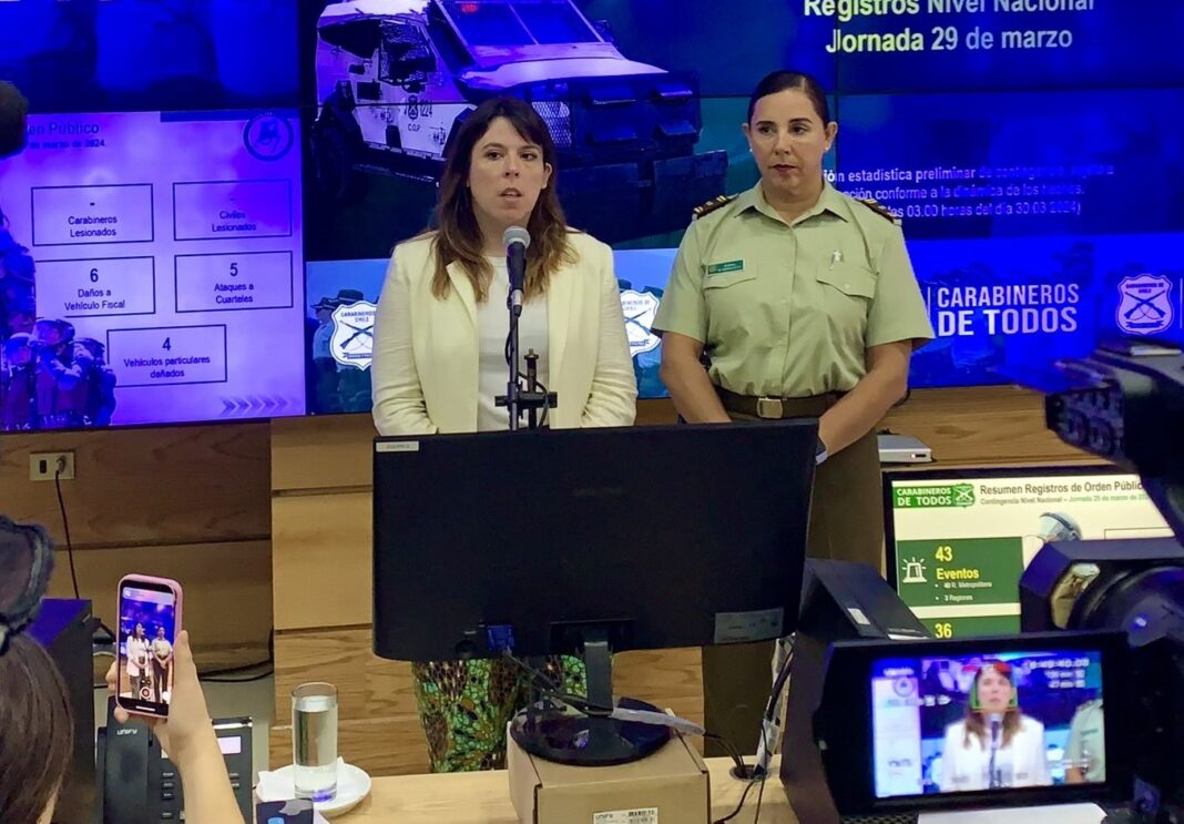 De acuerdo con lo relatado por la general, hubo ataques a cinco cuarteles policiales. Además, se registraron seis vehículos fiscales dañados y cuatro particulares. Estos últimos se reportaron en las comunas de Pedro Aguirre Cerda, El Bosque y San Bernardo.