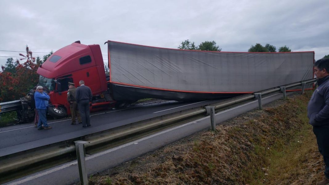 Fue en la mañana de este viernes, a eso de las 06.50 am, cuando se registró un nuevo accidente en la ruta 5, a la altura del Km 901, sector Trafún, luego que el conductor de un camión -por causas que se investigan- impactó la máquina contra la barrera de contención dispuesta en el lugar en dirección norte a sur, terminando volcada a un costado del camino.