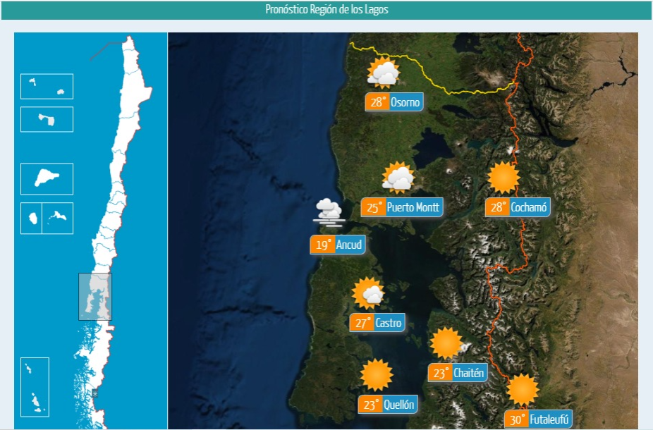 Según el pronóstico de la Dirección Meteorológica de Chile para este lunes 05 de enero, se esperan temperaturas máximas que fluctuarán entre los 19 y 30 grados en distintos puntos de la región, con registros de hasta 28° en Osorno y Cochamó, 27° en Castro, 25° en Puerto Montt, 23° en Quellón y Chaitén, mientras que Ancud alcanzaría los 19° y Futaleufú los 30°, concentrándose los valores más altos en sectores interiores cordilleranos.