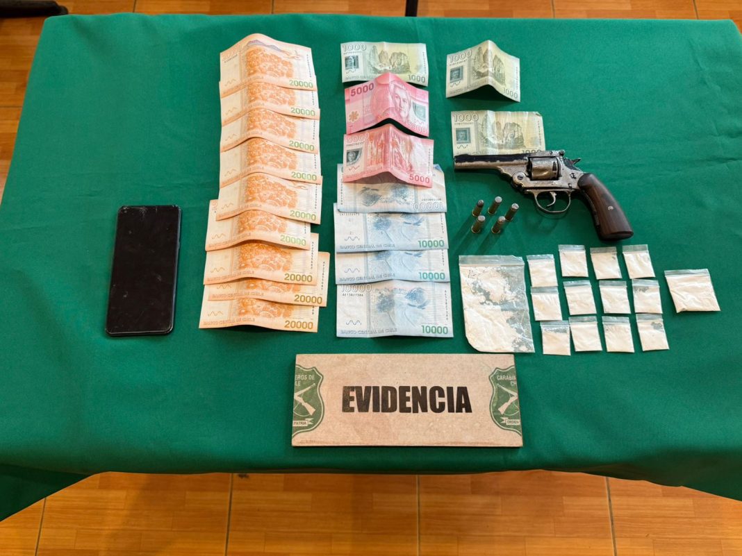Durante la fiscalización, Carabineros encontró un arma de fuego en el asiento trasero del vehículo. En el registro de vestimentas del joven se incautaron además 14 bolsas con clorhidrato de cocaína y cinco municiones de revólver calibre 38.