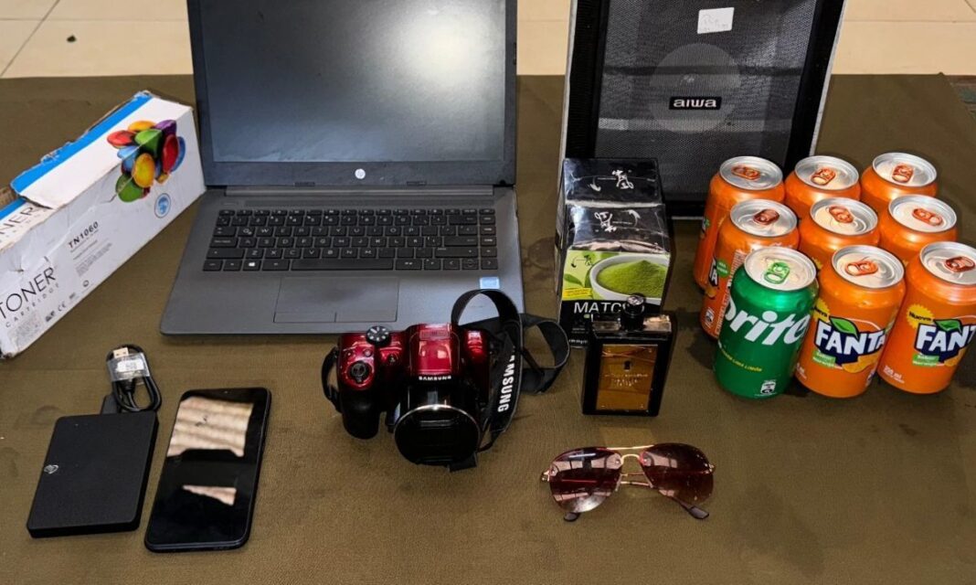 El personal policial realizó un control al sujeto, momento en el que se percataron que llevaba consigo un computador personal, teléfono celular, un disco duro, además de bebidas y una cámara fotográfica.
