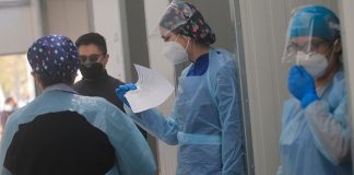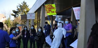 Funcionarios del hospital de campaña de Puerto Montt se manifiestan ante...