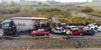 Vehículos quemados y apilados: registro aéreo muestra magnitud del accidente en...