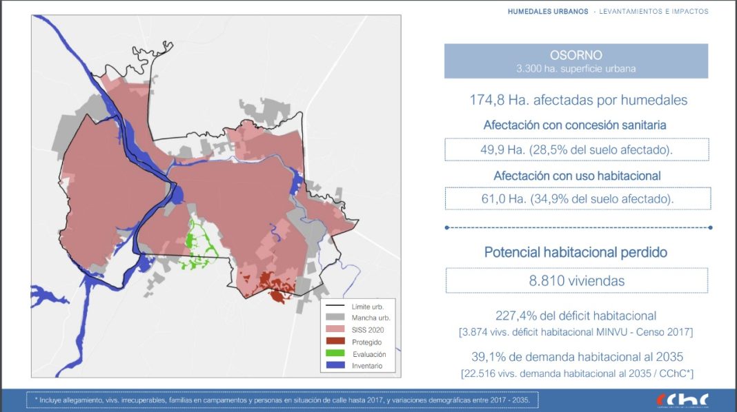 Este lunes sesionó la Comisión de Medio Ambiente y Bienes Nacionales del Senado para seguir discutiendo la modificación a la Ley de Humedales Urbanos que agrega mecanismos de participación directa de la ciudadanía en la solicitud de reconocimiento de estos terrenos acuosos, hasta ahora potestad exclusiva municipal.En la ocasión, representantes de la Cámara Chilena de la Construcción presentaron un estudio sobre la afectación en la potencial construcción de viviendas por terrenos declarados como humedales en diez ciudades desde Coquimbo a Punta Arenas, incluyendo a Osorno, Puerto Montt y Puerto Varas en la región de Los Lagos.En el estudio se estimó que en esas diez ciudades hay poco más de 8 mil hectáreas de humedales, donde se podrían construir cerca de 212 mil viviendas, y en total el déficit es de casi 75 mil viviendas en las comunas involucradas. En Osorno son casi 175 hectáreas, con 8.810 viviendas que podrían construirse.El representante del gremio en Osorno, Andrés Angulo, dijo que urge buscar soluciones, considerando que históricamente se ha construido la ciudad en áreas de humedales.Por su parte, Karla Linco, ambientalista osornina e integrante de la Red Plurinacional de Humedales de Chile, señaló sentirse contrariada por la postura del gremio de la construcción, debido a que no se puede construir sobre estos terrenos.Angulo dijo que el problema en Osorno radica en la no actualización del plano regulador y la nula ampliación de la red sanitaria por parte de la empresa a cargo del servicio.Para Karla Linco la diferencia de paradigma radica en que los humedales permiten un mejor crecimiento urbano en el sentido de la convivencia de la comunidad con estos espacios protegidos, a diferencia de la postura de la Cámara de que estos terrenos dificultan el crecimiento urbano de las ciudades.