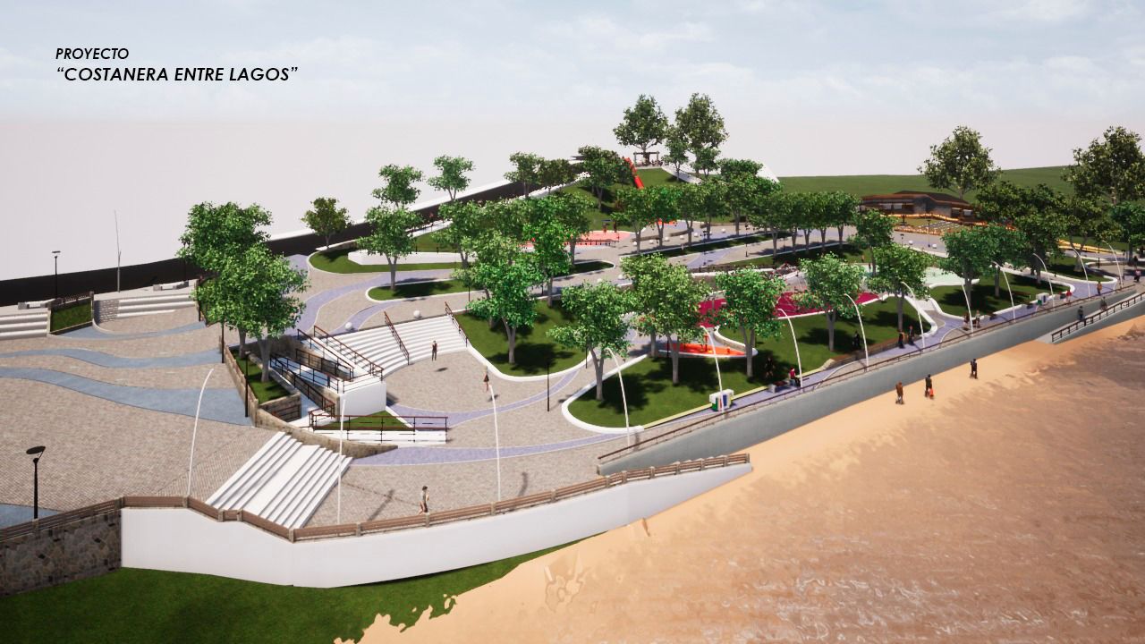 Según las especificaciones técnicas del proyecto “Mejoramiento Costanera Entre Lagos” se planifica intervenir una superficie superior a los 12.600 metros cuadrados, incluyendo explanada, muelle peatonal, centro de avistamiento de aves, embarcadero, equipamiento público, equipamiento urbano e iluminación.