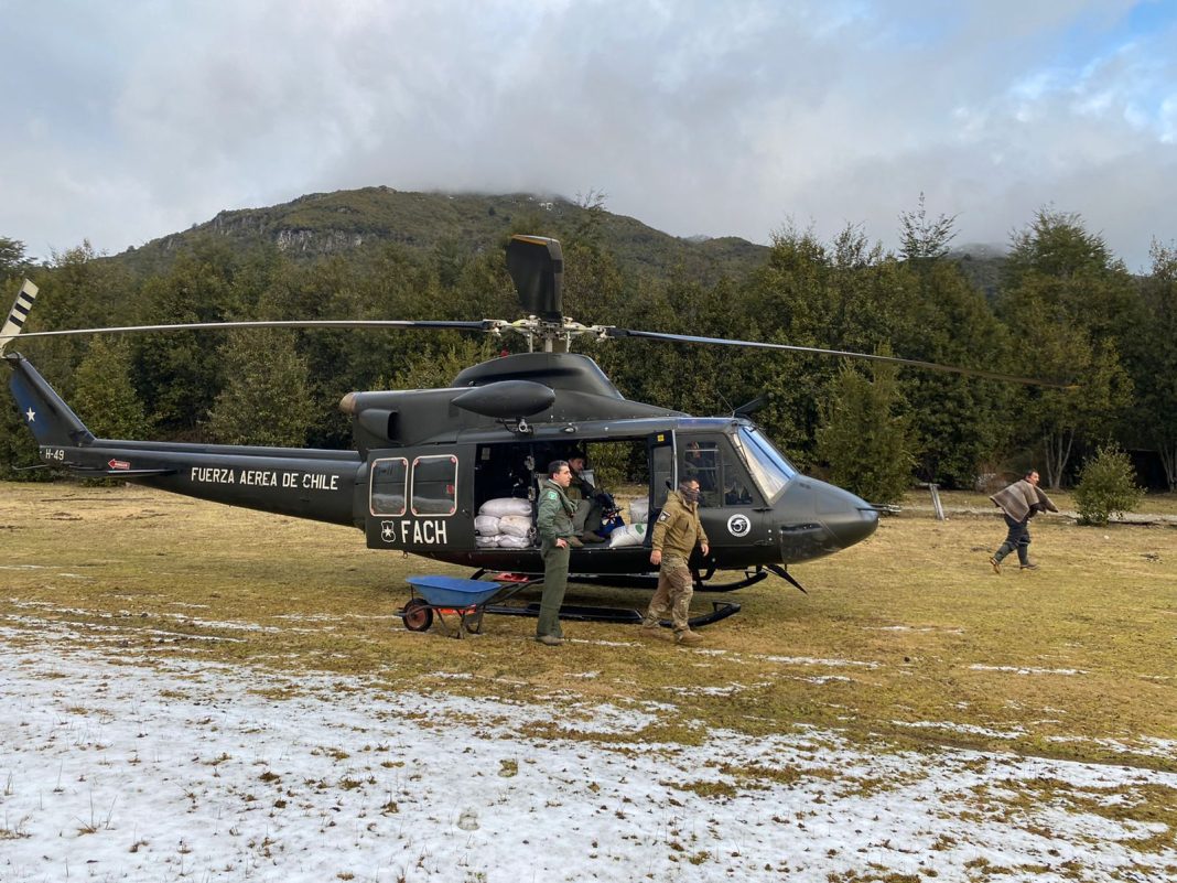 Debido a esta situación, esta semana la Fuerza Aérea de Chile, mediante el empleo de un helicóptero Bell 412 de la III Brigada Aérea, realizó movimiento de carga en la cordillera de la Región de Los Lagos para ir en apoyo de las familias afectadas por la acumulación de nieve.