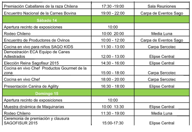 Sagofisur 2015 contará con un amplio abanico de actividades con cerca de 250 expositores, cocinas en vivo, encuentros de productores, el tradicional rodeo chileno y la infaltable elección de la reina de la presente versión de Sasgo Fisur 2015.