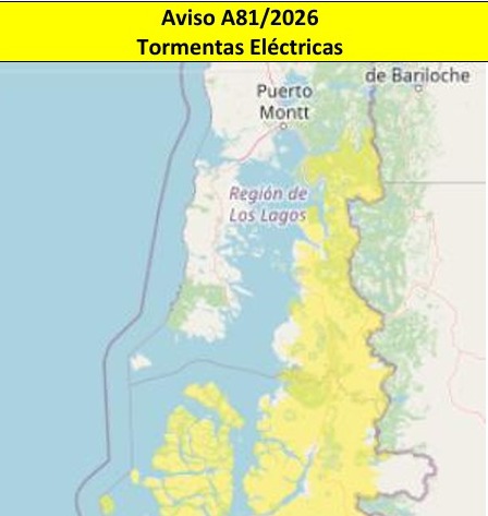 La Dirección Meteorológica de Chile (DMC) informó la vigencia del Aviso Meteorológico, que pronostica probables tormentas eléctricas para este lunes 23 de febrero en la Región de Los Lagos.