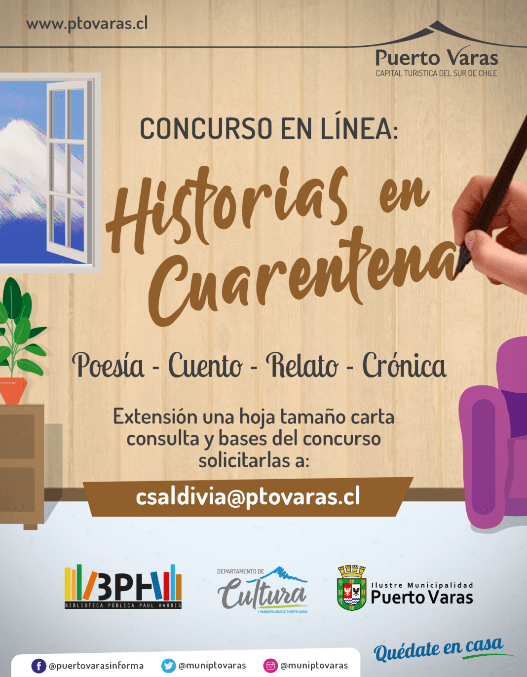 El Departamento de Cultura y la Biblioteca Municipal Paul Harris de Puerto Varas invitan a la comunidad a participar del concurso en línea denominado “Historias en Cuarentena”, en donde los interesados podrán participar a través de poesía, cuento, relato o crónica, el concurso está abierto a niños, niñas, jóvenes, adultos y adultos mayores.