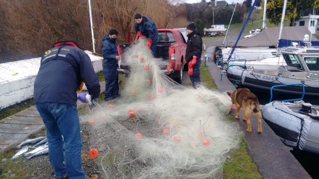 Funcionarios del Servicio Nacional de Pesca y Acuicultura junto a personal de la capitanía de Puerto de Puerto Varas, en el marco de un operativo de fiscalización detectaron en lago Llanquihue específicamente en el sector Centinela una red de 80 metros y en el sector Totoral, una red de a lo menos 500 metros con 36 unidades de salmones enmallados.