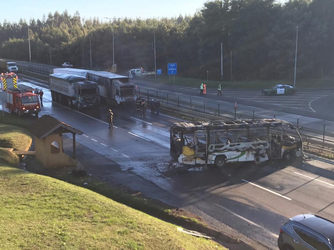 En esta oportunidad, desconocidos atacaron dos camiones y un bus de pasajeros, los que resultaron incendiados en la ruta 5 Sur, hecho registrado en horas de esta madrugada de miércoles. El hecho se produjo a la altura de la localidad de Pidima, en la comuna de Ercilla.