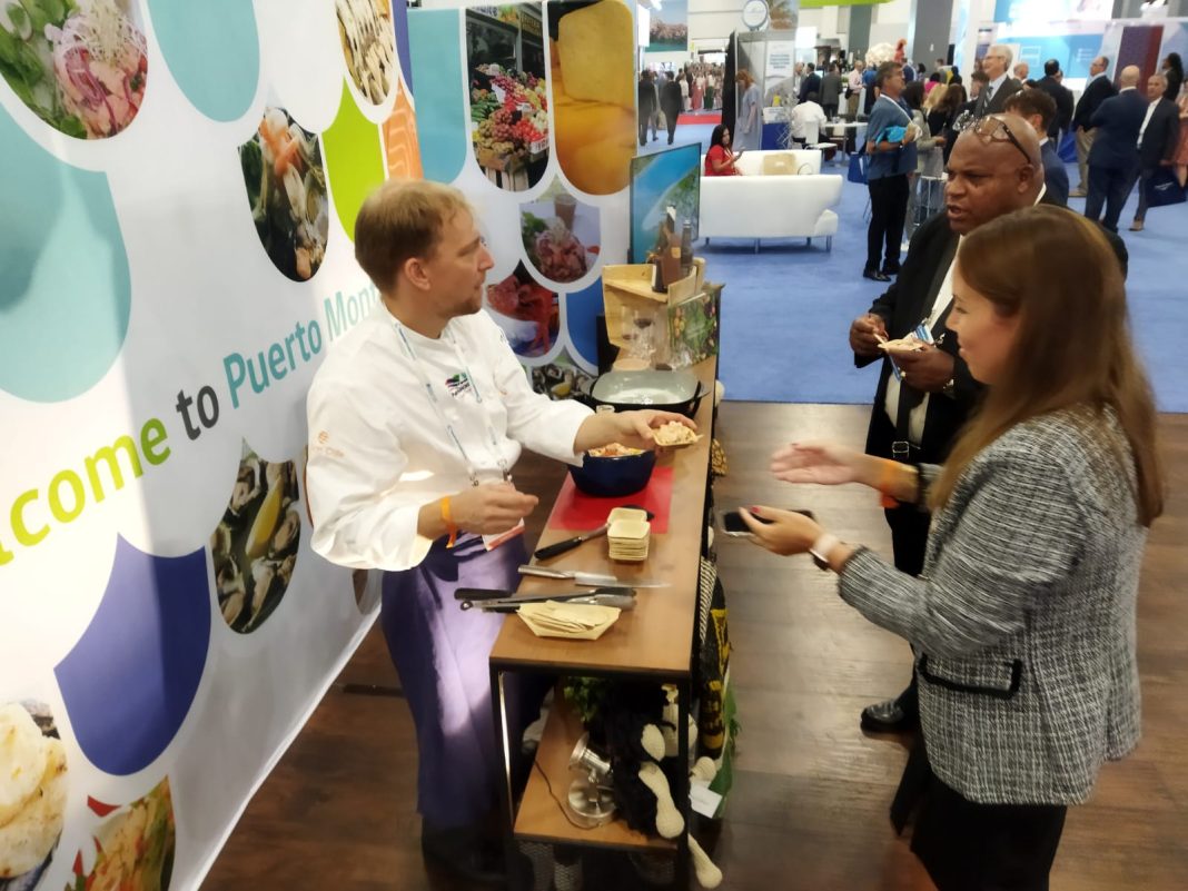El stand de la capital regional en la Feria de Cruceros de Miami es compartido con la Municipalidad de Castro, lugar en el que se exponen los atractivos turísticos de la región para atraer más cruceros durante todo el año.