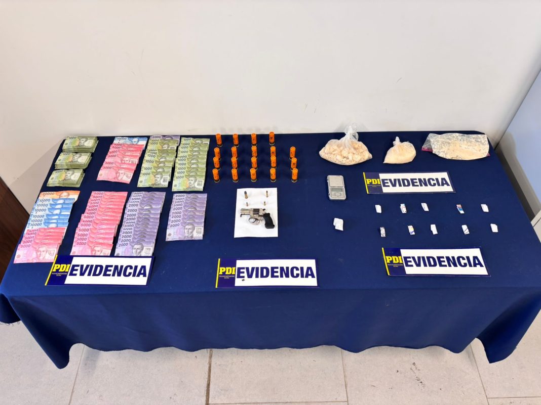 Un hombre de 67 años y una mujer de 23 años fueron detenidos tras una investigación realizada por detectives del Modelo Territorial Cero de la PDI que desarticuló un punto de venta de drogas, incautando 917 gramos de droga, entre clorhidrato de cocaína y cocaína base, un revólver, sin registro, municiones y dinero en efectivo.