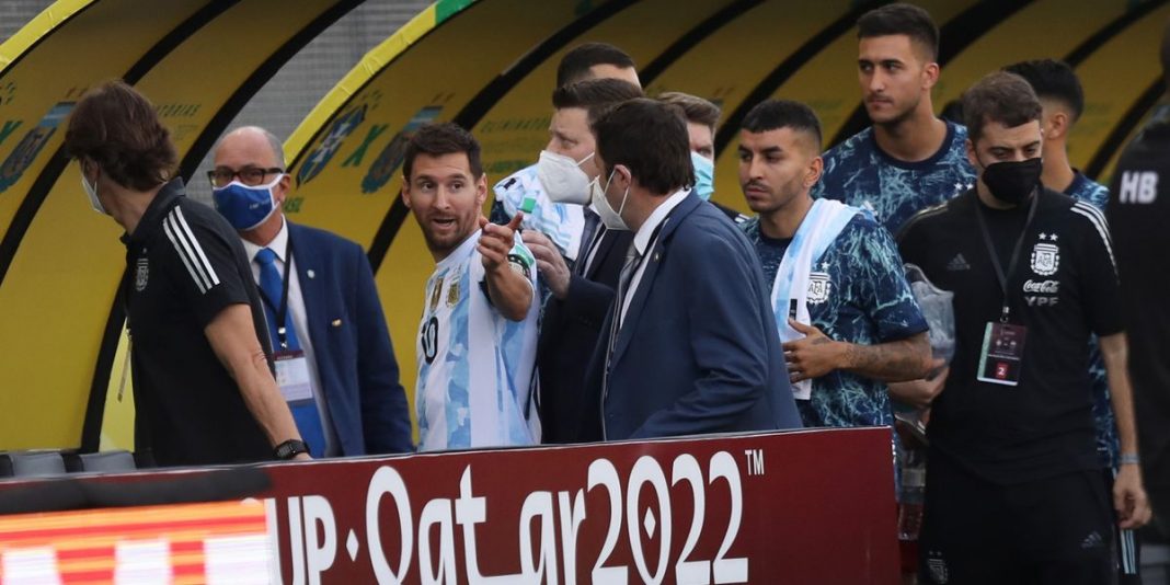 Esto luego que el cotejo fuera suspendido a los 6 minutos, luego del ingreso de personal sanitario a la cancha en Sao Paulo. El hecho ocurre luego que se diera a conocer previamente que Brasil buscara deportar a cuatro jugadores de la selección trasandina. Se trata de los futbolistas Emiliano Martínez, Cristián Romero, Giovani Lo Celso y Emiliano Buendía, acusándolos de entregar información falsa para ingresar al país. En ese sentido, la Agencia Nacional de Vigilancia Sanitaria (Anvisa) había señalado a través de un comunicado que “ante la información de que cuatro jugadores argentinos ingresaron a Brasil incumpliendo las normas sanitarias del país, al declarar supuestamente información falsa en un formulario oficial de la autoridad sanitaria brasileña, Anvisa se reunió con representantes del Ministerio de Salud y la Coordinación de Control de Enfermedades del Departamento de Salud del Estado de São Paulo este sábado”. Al respecto, se indicó que la información falsa sería que los jugadores habrían declarado que no pasaron por ninguno de los cuatro países con restricciones en los últimos 14 días, siendo uno de ellos Reino Unido, país donde militan los futbolistas. En medio de lo que ocurre en la cancha, la cuenta oficial de Twitter de la Selección Argentina señaló que el partido quedó suspendido.