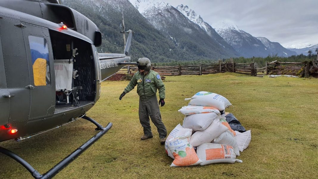 En esta ocasión el helicóptero Bell 412 de la Fach, trasladó desde Puerto Montt, 2 toneladas de alimento para animales y víveres no perecibles hasta dicho sector cordillerano en la provincia de Palena.