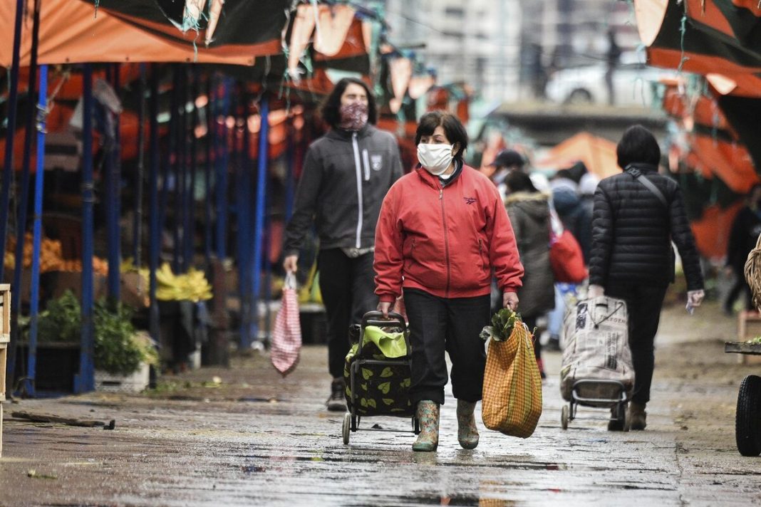 una mujer usando una mascarilla recorre la feria del estero Marga Marga, luego de las lluvias que afectaron a los locatarios y en el contexto de cuarentena total en que se mantiene la comuna.