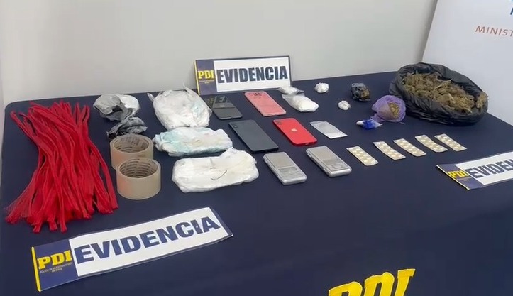 Durante el procedimiento, desarrollado en una cabaña arrendada que los imputados utilizaban como centro de operaciones, se incautaron diversos tipos de droga como clorhidrato de cocaína, cocaína base, ketamina y cannabis sativa, además de comprimidos de clonazepam y materiales utilizados para el empaquetamiento y lanzamiento de la droga hacia el recinto penitenciario.