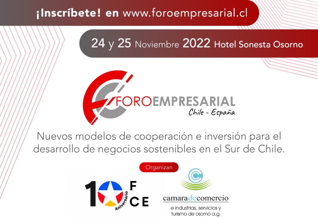En este Foro Empresarial Chile-España, autoridades y expertos de ambos países intercambiarán experiencias para lograr un desarrollo territorial equilibrado y sostenible, con políticas de cohesión nacionales y regionales.  Además, se analizarán las diferentes carteras de inversión y la importancia de la digitalización a la hora de conseguir un país innovador, científico, emprendedor y tecnológicamente avanzado, dotado de las capacidades necesarias para lograr un desarrollo de carácter horizontal y transversal. Por último, se evaluarán diferentes enfoques, sectores y agentes sociales que participan en distintos ámbitos del desarrollo regional como son la gestión de los recursos naturales, la eficiencia energética, la transformación industrial, la economía azul, la cultura, el ocio o el turismo, entre otros. El presidente de la Cámara de Comercio de Osorno, Rodrigo Ibáñez, sostuvo que esta instancia está siendo organizada por las regiones de Los Ríos y Los Lagos. El timonel gremial expuso la importancia de generar este tipo de eventos, con el fin de generar alianzas público-privadas, más aún, en tiempos de crisis. Este foro reunirá a una serie de autoridades, como también invitados internacionales, como embajadores y parlamentarios de España. Este evento se llevará a cabo el próximo 24 y 25 de noviembre en las dependencias del Hotel Sonesta de Osorno. Las inscripciones para participar de la serie de actividades están disponibles en foroempresarial.cl.