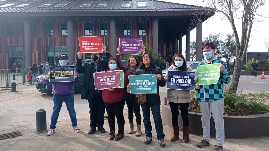 Es el caso de los docentes y funcionarios de la Universidad Austral sede Puerto Montt, quienes llegaron hasta el frontis del Teatro del Lago para pedir al mandatario que interceda ante la Rectría de la casa universitaria por la huelga que desarrollan en el marco del proceso de negociación colectiva.