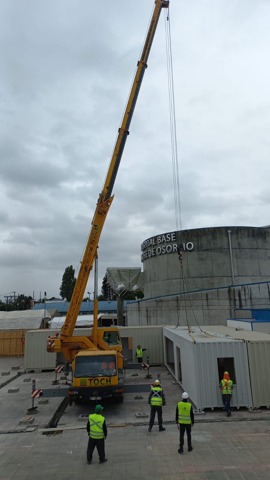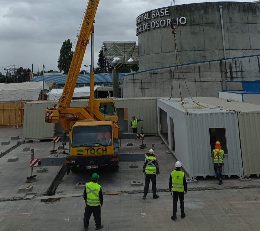El proyecto de esta urgencia pediátrica del Hospital Base de Osorno esta a cargo del Ingeniero, Rolando Willer de la empresa “Maqtainer” de Valdivia, la cual instala los 11 contenedores de 28,8 mts 2 en el sector aledaño al Servicio de Urgencia del centro asistencial, para lo cual se utiliza una Grúa pluma móvil emplazada en un camión, con la cual se levantan y ubican en sus bases.