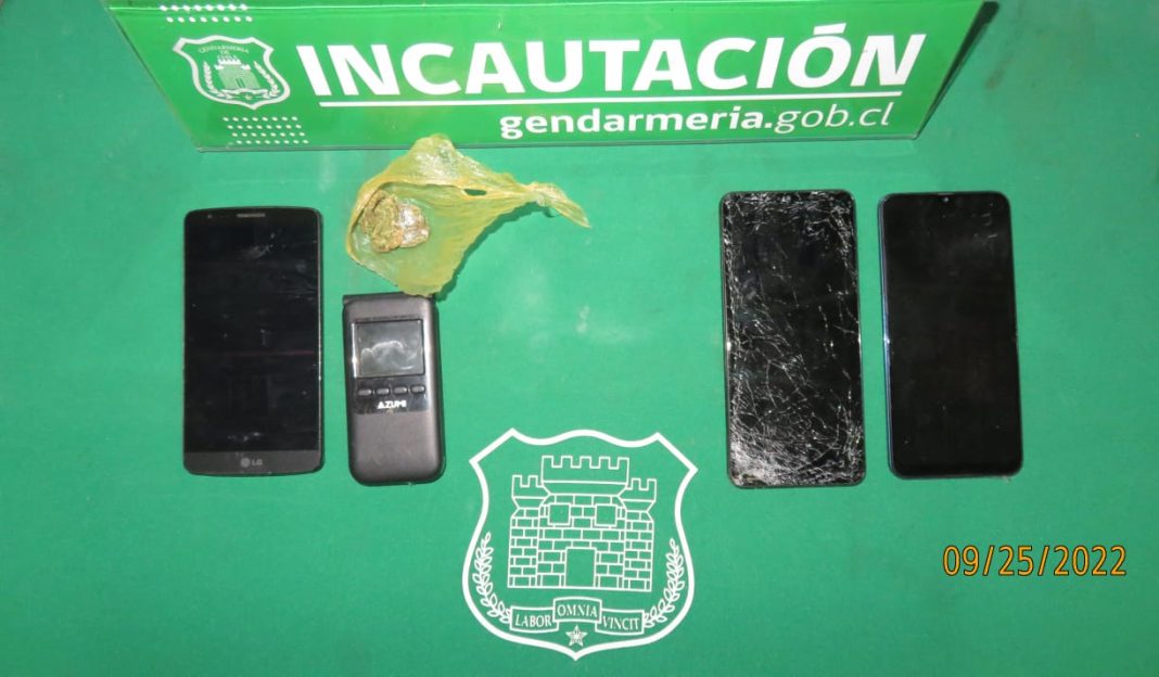 En total se decomisaron cuatro teléfonos celulares y un envoltorio de nylon con sustancia vegetal que, tras la prueba de campo efectuada por el equipo ECA de Osorno, fue confirmada como cannabis sativa.