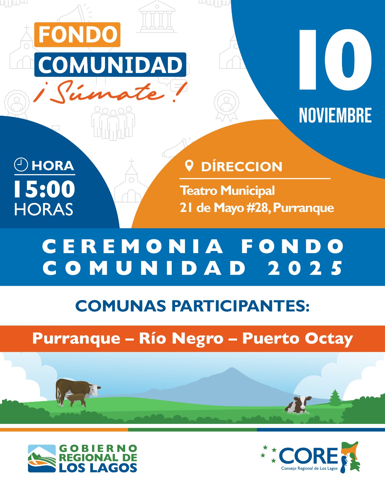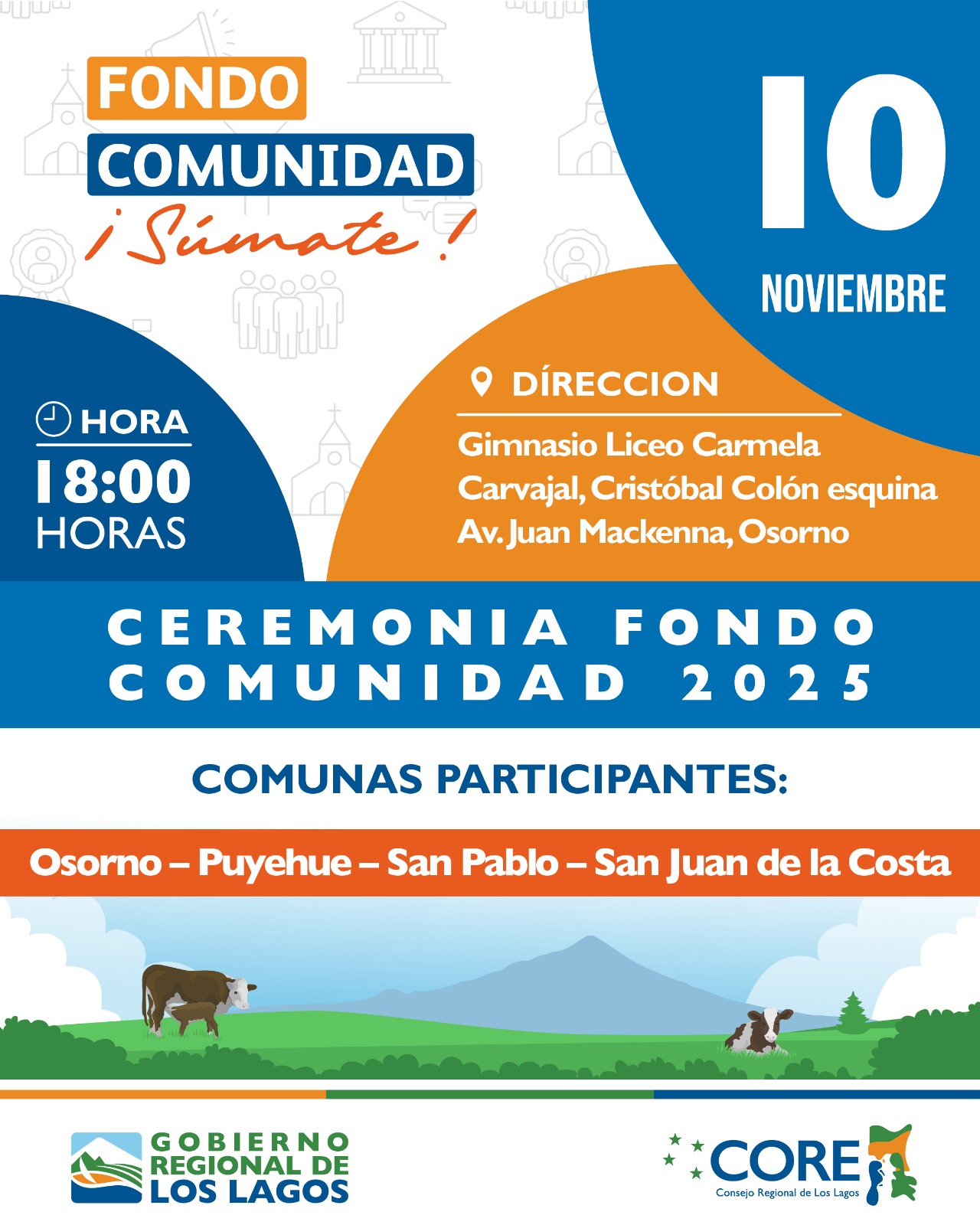 Este lunes 10 de noviembre, el Gobierno Regional de Los Lagos llevará a cabo las ceremonias de entrega del Fondo Comunidad 2025 en la provincia de Osorno, instancia que reconoce a las organizaciones sociales que resultaron beneficiadas con este importante programa de financiamiento regional.