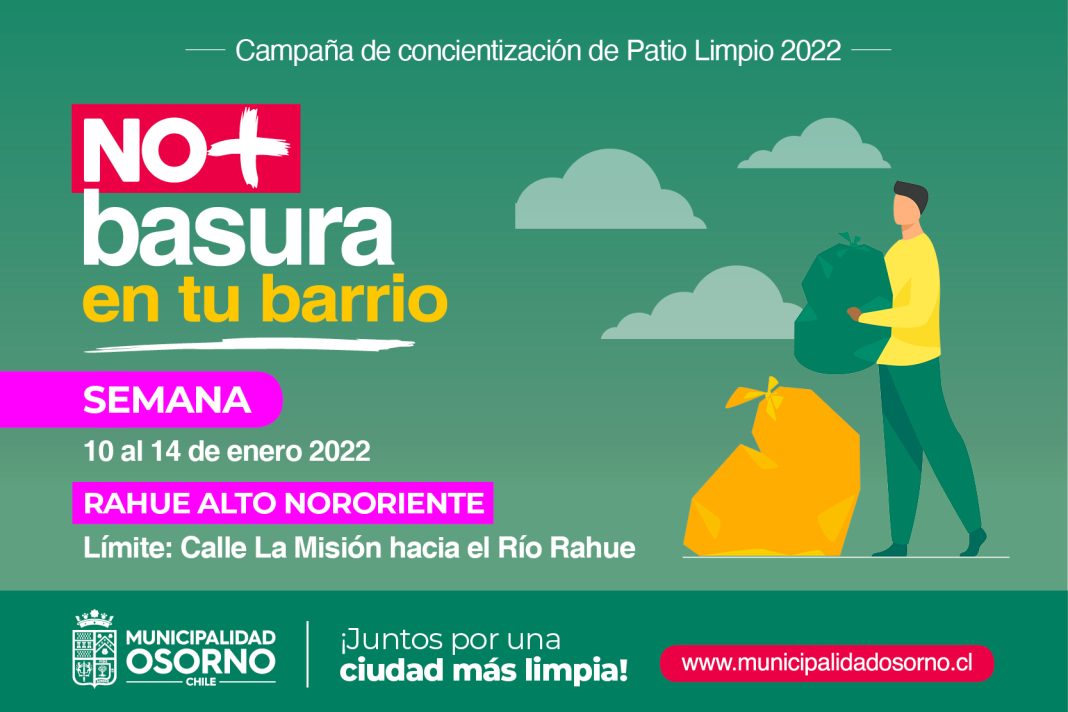 Entre hoy lunes 10 y este viernes 14 de enero, el programa Patio Limpio del municipio de Osorno se estará llevando a cabo en el sector nororiente de Rahue, específicamente en el cuadrante que incluye conjuntos habitacionales desde calle La Misión hacia el río Rahue, entre ellas: Población Schilling, Villa Santísima Trinidad, Villa Portal Osorno, Villa Unión y Futuro y Villa Candelaria.