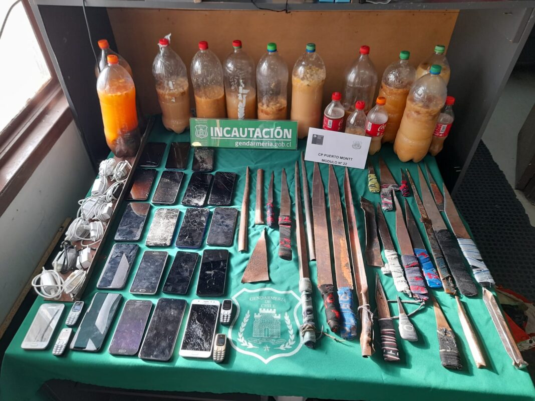 En el módulo 22 Alto Bonito se decomisaron 26 armas blancas de confección artesanal, 24 teléfonos celulares, 15 botellas de licor artesanal y 12 cargadores. En el módulo 1 de Osorno se incautaron 4 armas blancas de confección artesanal, mientras que en los recintos penales de Ancud y Castro no se encontraron elementos ni sustancias prohibidas.