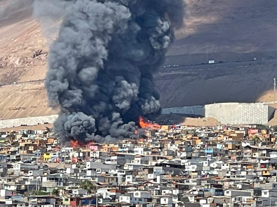 Durante la tarde de este lunes se registra un voraz incendio en el campamento Laguna Verde, en la ciudad de Iquique. El siniestro deja al menos 10 viviendas afectadas, todas de material ligero, ya que en el sector hay una toma. En el lugar hay peligro de propagación, debido al tipo de construcción. Según información preliminar, todas las compañías de Bomberos de la ciudad tarapaqueña trabajan en la extinción de las llamas. Cabe señalar que distintos registros en las redes sociales dan cuenta de la gran columna de humo, que es visible desde varios puntos y ha generado alarma entre los habitantes. Según indicó Carabineros, en conversación con 24 Horas, las condiciones climáticas son favorables, ya que el viento se desplaza hacia los cerros, en dirección a sectores donde no hay casas. Sin embargo, la falta de grifos en el sector -apenas hay uno solo- dificulta las labores de extinción.