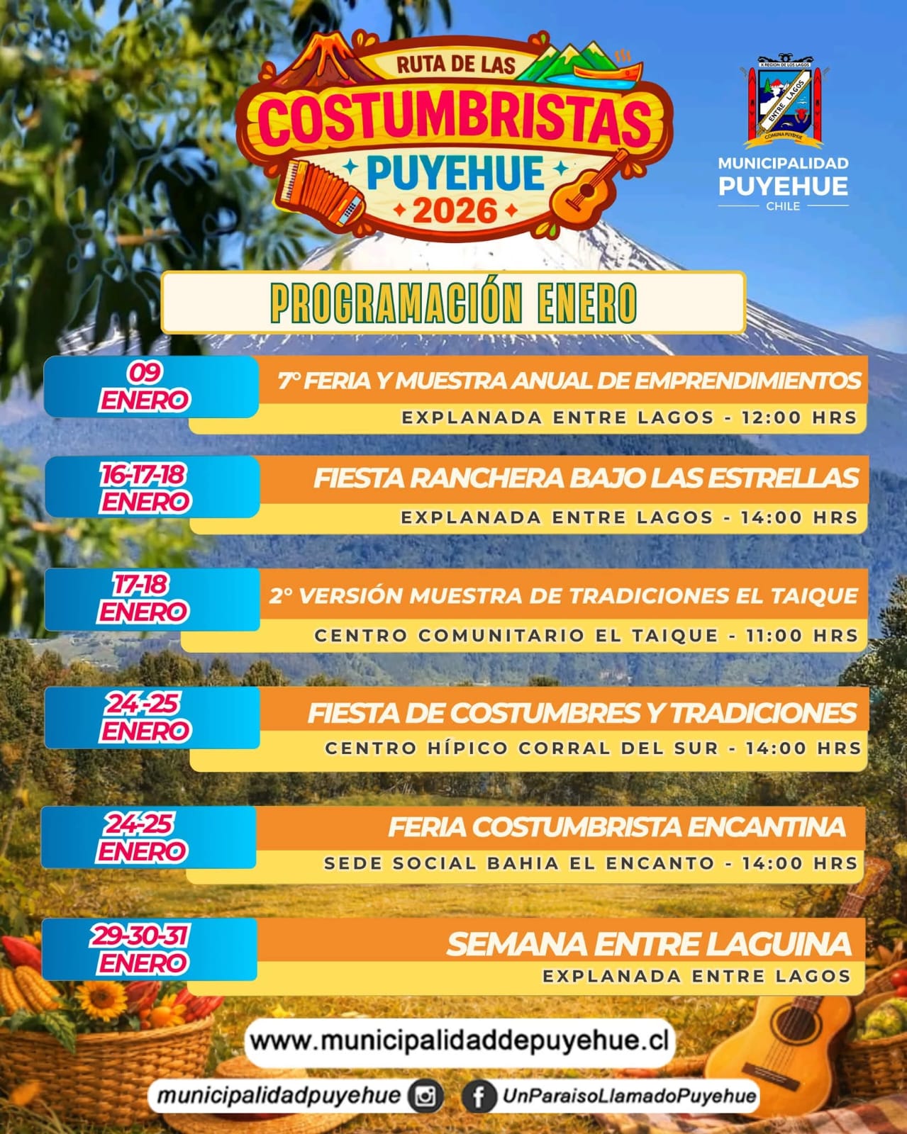 La Ilustre Municipalidad de Puyehue realizó el lanzamiento oficial de las actividades de verano 2026 en la comuna de Entre Lagos, instancia en la que se dio a conocer una nutrida parrilla de eventos culturales, artísticos y costumbristas que se desarrollarán durante la temporada estival, destacando la tradicional Semana Entrelaguina y la XXVII versión del Festival Internacional de la Música Mexicana.