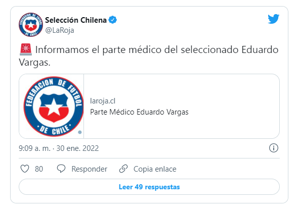 Inicio Deportes La Roja pierde a Eduardo Vargas para el duelo ante Bolivia: fue... DeportesInformando Primero La Roja pierde a Eduardo Vargas para el duelo ante Bolivia: fue liberado por lesión Por Radio SAGO - 30 de enero de 2022 138 WhatsAppFacebookTwitterLinkedinTelegramEmail La selección chilena informó durante la mañana de este domingo que el delantero Eduardo Vargas fue liberado de la nómina para enfrentar a Bolivia. El delantero presentó una contusión de esquince de rodilla por lo que no podrá estar ante Bolivia en La Paz el próximo martes. Noticia en desarrollo…. Artículos relacionadosMás del autor Informando Primero El Corazón de la Recuperación: Hospital Puerto Montt lanza talleres educativos para pacientes cardíacos y sus familias Informando Primero «Vergonzoso»: Parlamentarios de la región de Los Lagos critican que montos no ejecutados en vivienda paguen expropiación de toma Informando Primero PDI desarticula estructura criminal e incauta 62 kilos de droga avaluada en más de $630 millones Informando Primero Ovinos y caprinos de Chile con buen balance en SAGOFISUR 2025 Informando Primero Con ferias y alianzas, DAEM Osorno busca revertir baja matricula en establecimientos públicos Actualidad Incendio en losa de aeropuerto de Sao Paulo obliga la evacuación de avión de Latam