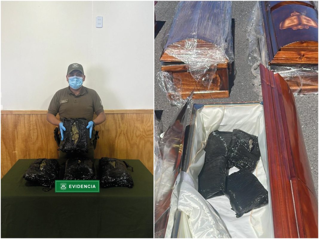 Tras una revisión voluntaria del compartimiento de carga, se hallaron cuatro paquetes de marihuana ocultos al interior de uno de los ataúdes que eran transportados en el vehículo.