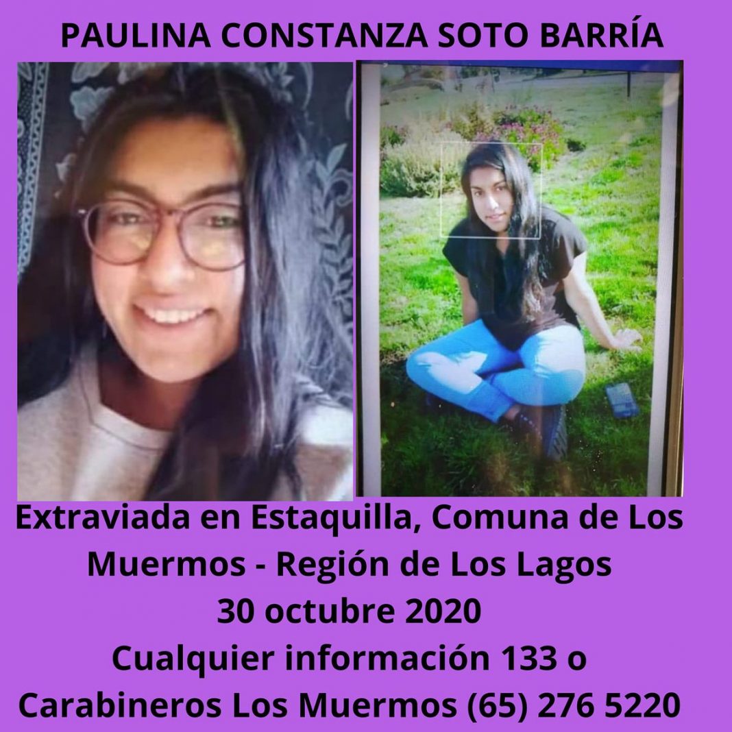 Se trata de Paulina Constanza Barría Soto de 17 años, quien fue hallada sin vida en un sector boscoso distante a unos 200 metros del lugar donde habría sido vista por última vez en el sector rural la Pampina, en la comuna de Los Muermos. De acuerdo a los antecedentes preliminares, la causa y data de su muerte aún no está determinada la que será objeto de investigación, para establecer si se trata de un suicidio o hubo intervención de terceras personas en el deceso de la adolescente. Paulina Constanza Barria Soto se encontraba desaparecida desde el mediodía del pasado viernes 30 de octubre y fue la tarde de este sábado 7 de noviembre que un voluntario de Bombero de Puerto Montt, que se encontraban trabajando en las labores de búsqueda, quien encontró el cuerpo sin vida en un lugar de difícil acceso.