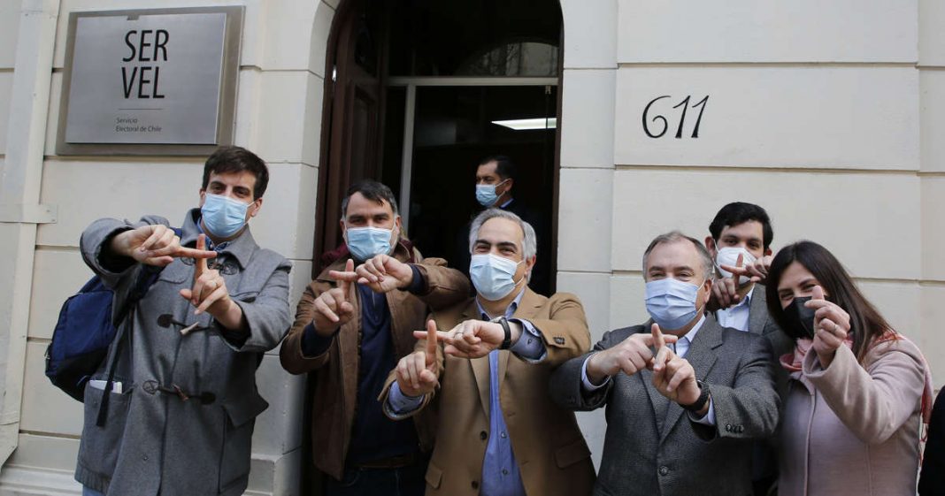 Los presidentes de Renovación Nacional, Francisco Chahuán; de Evópoli, Andrés Molina; y de la Unión Demócrata Independiente, Javier Macaya, inscribieron hoy ante el Servicio Electoral el nuevo pacto parlamentario oficialista, llamado Chile Podemos +.