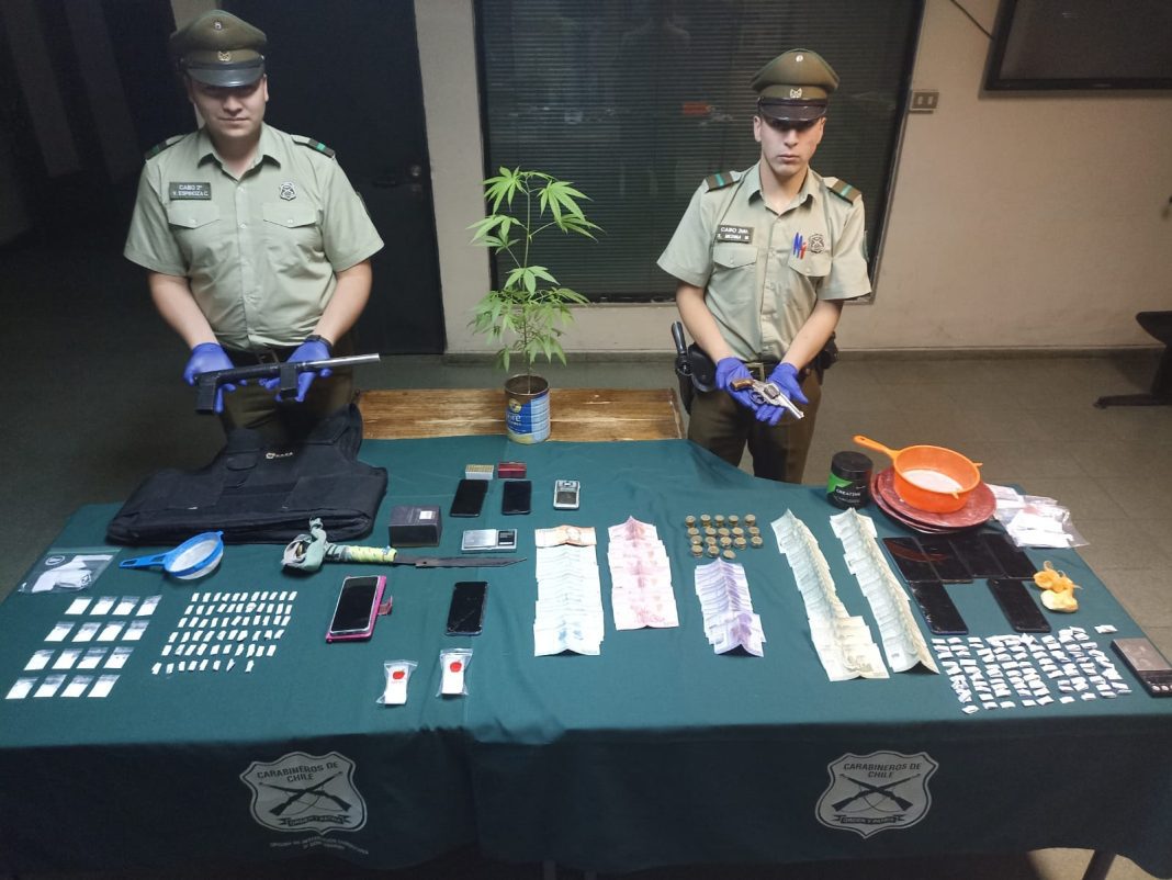 El grupo fue aprehendido en el campamento Folilche de Rahue Alto, donde además se incautaron 84 gramos de pasta base de cocaína, $520.000 pesos en dinero en efectivo, 50 cartuchos calibre 22, 01 revólver calibre 22, un arma de fabricación artesanal tipo escopeta y un chaleco antibalas, detalló la capitán Romina Cifuentes, subcomisario administrativo de la Tercera Comisaría de Osorno.