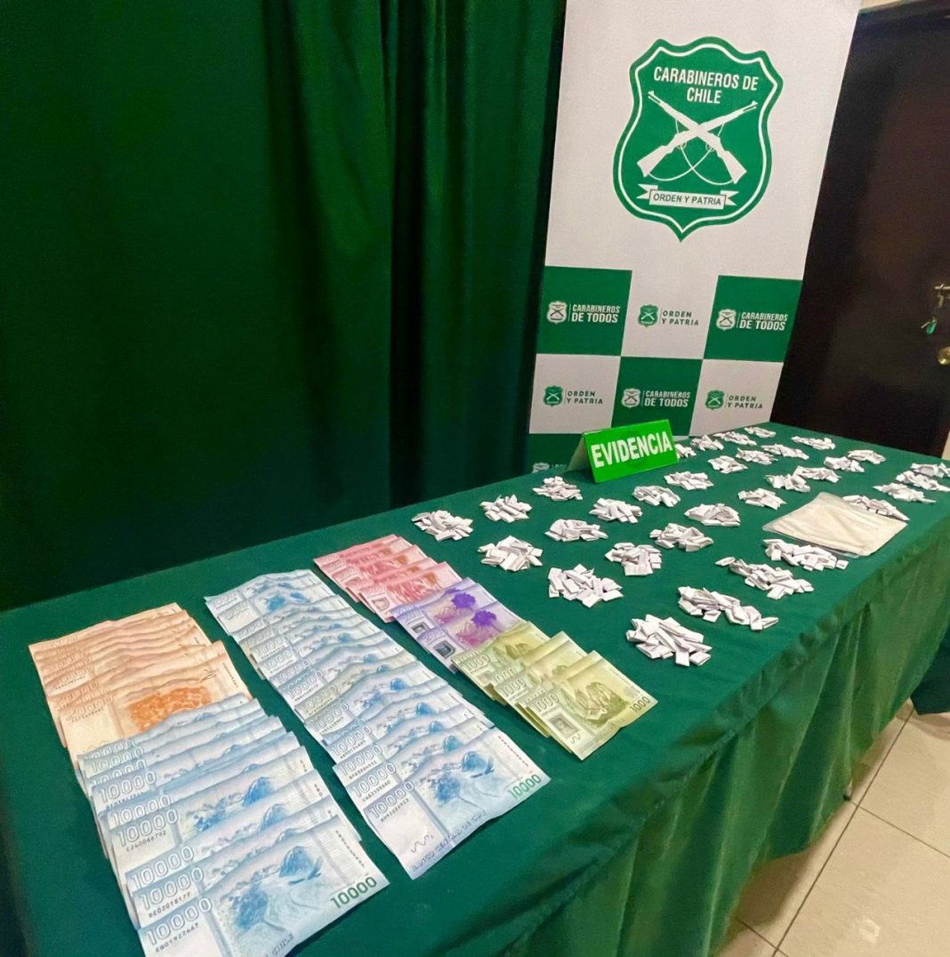 Carabineros decomisó 3.490 dosis de pasta Base de cocaína con un avalúo de 13 millones 960 mil pesos. Además, fueron incautados 931 mil pesos en dinero efectivo.