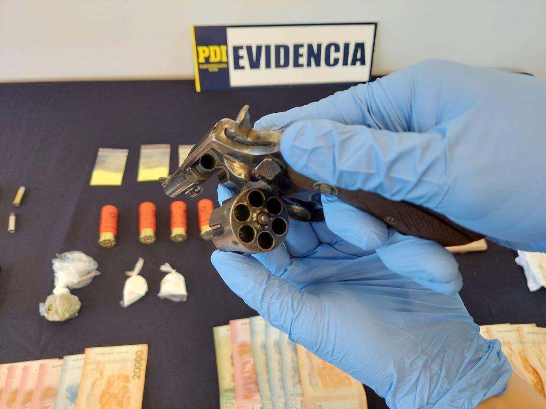 Detectives de la Brigada de Investigación Criminal Osorno detuvieron a dos sujetos en el sector de Rahue Alto tras ser sorprendidos efectuando una transacción de droga en momentos que los oficiales realizaban diligencias en el sector. Producto de ello, detectives se percataron que uno de los sujetos, quien posee antecedentes policiales por porte de arma cortante y hurto, mantenía un arma, la cual corresponde a un revólver calibre .32 apta para el disparo. Junto con ello se le decomisaron 3.75 gramos de Ketamina, 7.52 gramos de cannabis sativa y una licencia de conducir falsificada. En tanto, el segundo sujeto mantenía entre sus pertenencias una balanza digital. Tras gestionar la respectiva orden de entrada y registro, detectives allanaron una vivienda en el sector de Rahue, incautando 25,51 gramos de cannabis, 9.43 gramos de clorhidrato de cocaína, cartuchos calibre 12 y 75 mil pesos de dinero en efectivo. Producto de lo anterior, el primero de los sujeto fue puesto a disposición de tribunales por los Infracción a la Ley 20.000 de drogas, infracción a la Ley de Armas y Uso Malicioso de Instrumento Público. En tanto el segundo imputado quedó en libertad y citado por la Fiscalía. Cabe destacar que el avalúo de la droga bordea los 500 mil pesos.