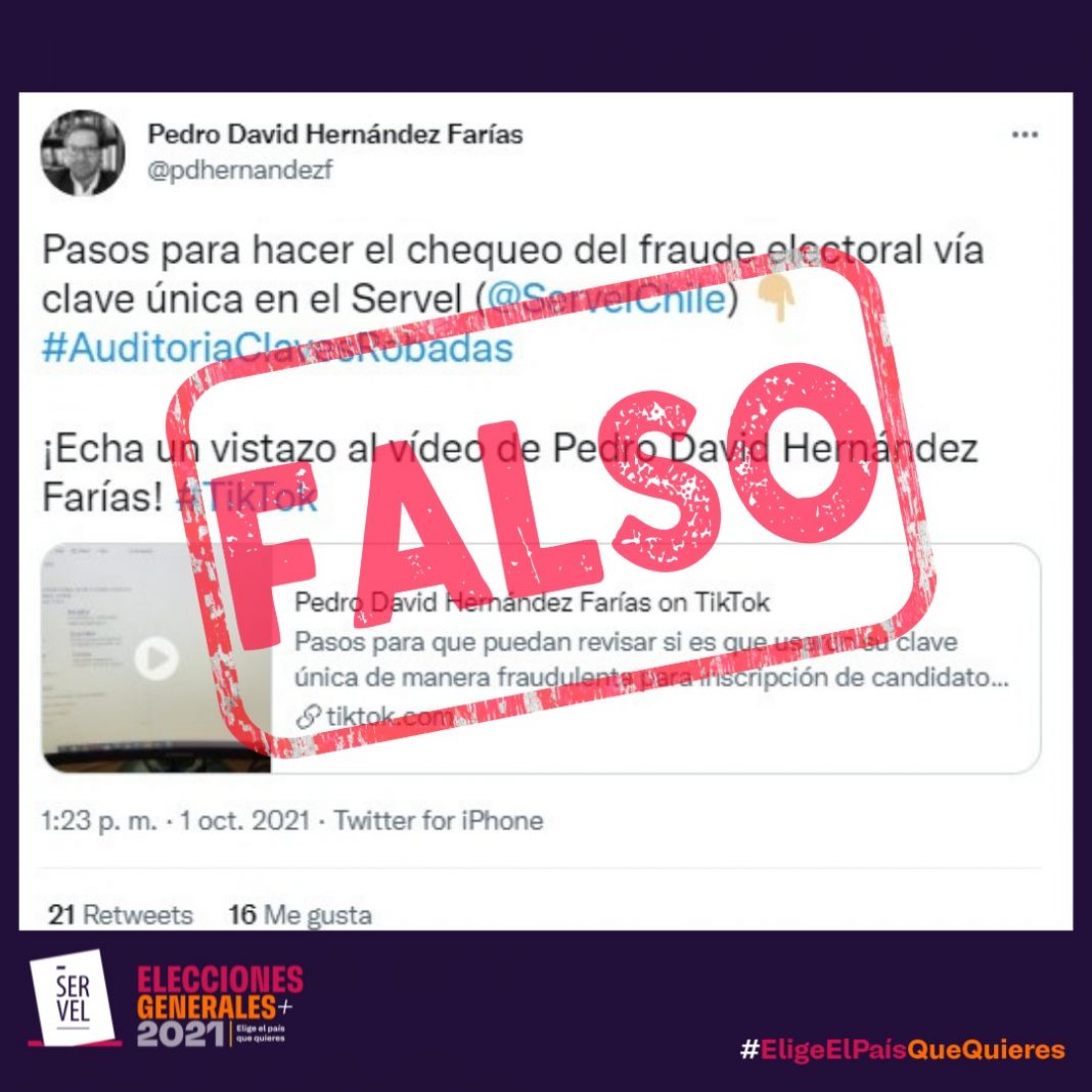 Aún cuando desde el Servicio Electoral desmintieron la información, señalando que estas afirmaciones son totalmente falsas. “Fake News: Si bien ClaveÚnica no pertenece al Servel, el registro de actividad de este sistema sólo indica el acceso a sitios webs. No constituye realización de trámite alguno”, indicaron a través de Twitter.