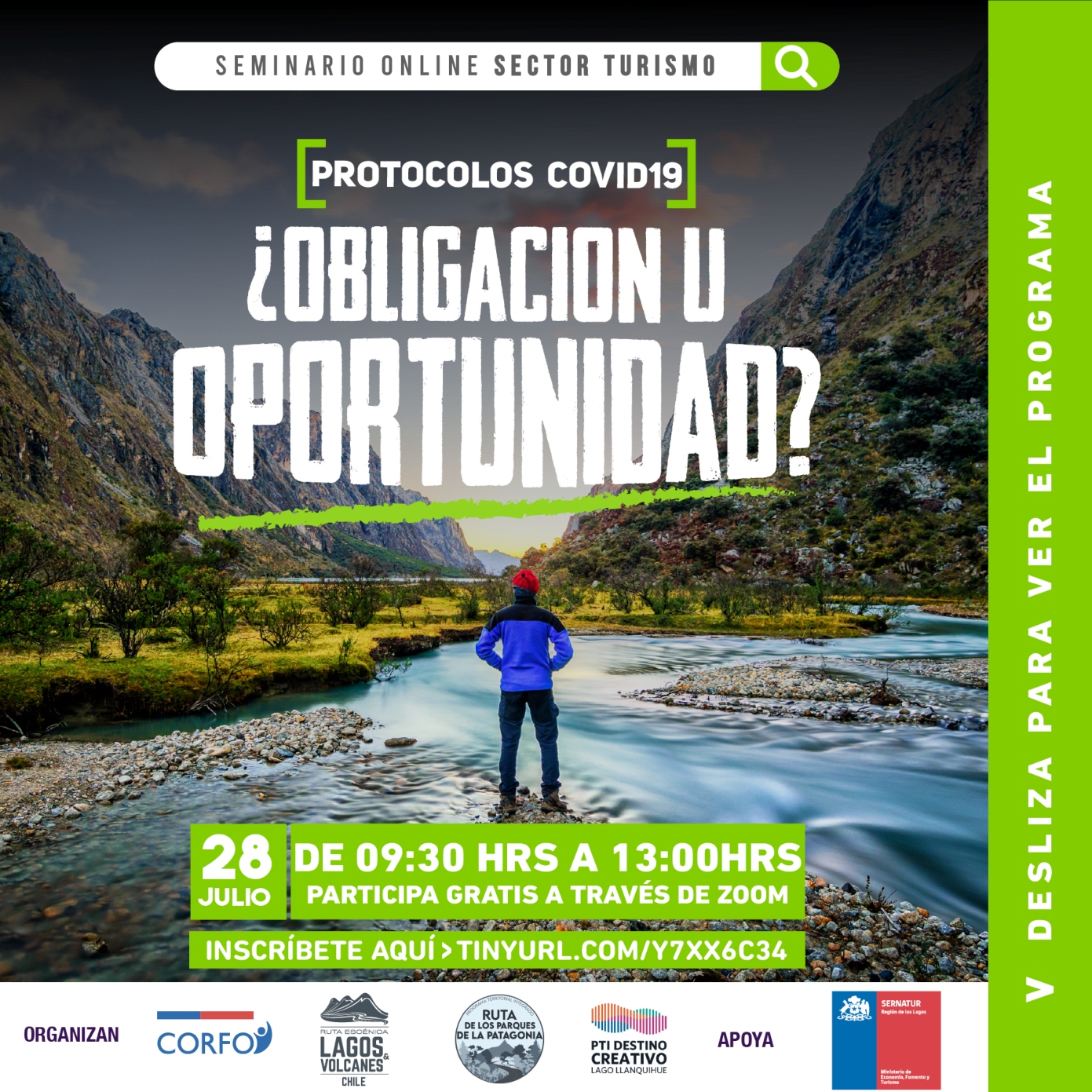 Este seminario on line es organizado por CORFO, Ruta Escénica Lagos y Volcanes Chile, Ruta de los Parques Patagonia, PTI Destino Creativo, APOYA y SERNATUR, para ello conversamos con el Gerente de Ruta Escénica Lagos y Volcanes, Rodrigo Moreno. Las inscripciones se pueden formalizar en el siguiente link: https://docs.google.com/forms/u/2/d/1senKuXYJZywJO97L9Gh7vXishb0WMmnHm3vdPUbtFpo/e dit?ts=5f05ecb7