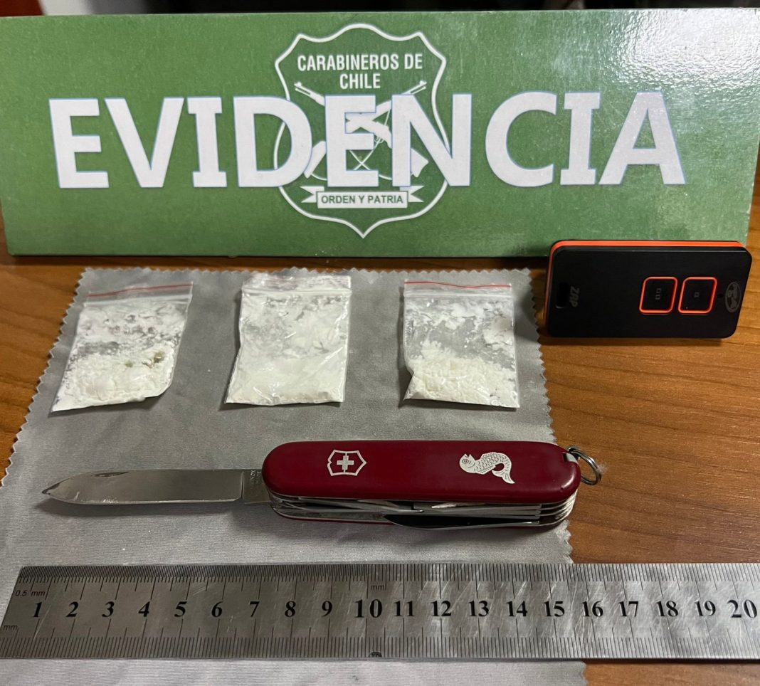 Tras el oportuno aviso, personal uniformado dio con el paradero de los delincuentes, gracias a la características de sus vestimentas. Ambos fueron detenidos, incautándose además, inhibidor de señal, un arma blanca y 3 bolsas contenedoras de 03 gramos de cocaína, detalló el capitán de la Primera Comisaría, Ignacio Gatica.