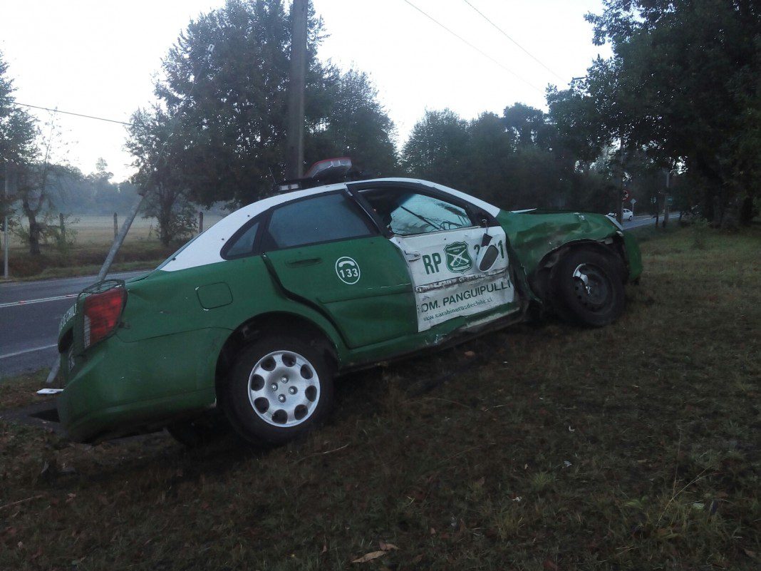 Un nuevo accidente de transito donde funcionarios de carabineros de Panguipulli se vieron involucrados. Esta vez el hecho se registro a la entrada de la comuna en la ruta CH 203, cuando carabineros se dirigía a un procedimiento policial colisionando en el camino con un móvil conducido por delincuentes que se encontraban robando en una vivienda de calle Ohiggins.