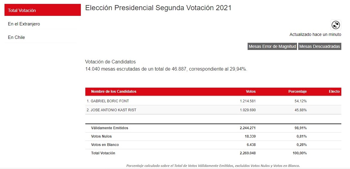 Fuente: Emol.Presidenciales: Boric está ganando con 54,1% contra 46,9% de Kast