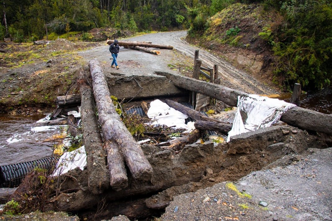 El puente sobre el río que nace en el Lago Coipue, en el sector de Colonia Yungay, colapsó tras el aumento de caudal debido a las intensas precipitaciones que afectaron la zona.