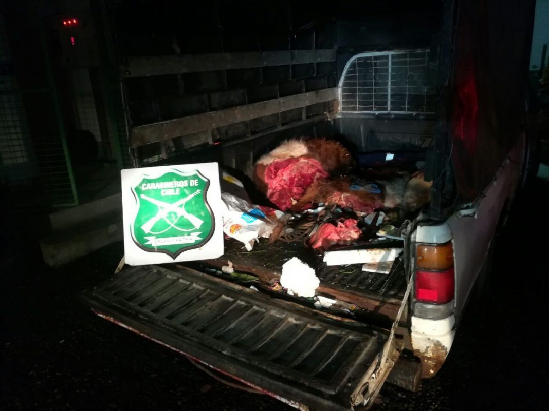 Carabineros desbarató a una banda dedicada al abigeato en Puerto Montt, recuperando más de 250 kilos de carne, un vehículo y diversas especies para la comisión del delito. Los individuos fueron sorprendidos en flagrancia por personal de Carabineros de la Tenencia Panitao, en los momentos en que huían desde el sector rural Los Pinis a bordo de una camioneta marca Chevrolet de color blanca, en la cual portaban la carne faenada, y los  elementos utilizados para la comisión del delito. El conductor no portaba documentos personales ni del vehículo, por lo que los ocupantes del móvil fueron trasladaos hasta el cuartel policial del sector. Así lo indicó el jefe de la Tenencia de Carabineros Panitao, Suboficial Mayor, José Sánchez Ortega. El Suboficial Mayor de Carabineros destacó que este operativo se logró concretar  gracias a la coordinación de trabajo preventivo que mantienen con los vecinos del sector,  quienes desde hace un tiempo a la fecha han trabajo de manera mancomunada para el combate de los delitos. Los detenidos por el robo de animales vacunos y su posterior faenamiento, fueron identificados como Andrés Sergio Navarro Melipillan, conductor del vehículo; y sus acompañantes, Walter Giovanni Vilches Soto, y Jaime Bryan Velásquez Garcés. Los tres sujetos, con domicilio en Puerto Montt, y amplios antecedentes penales, fueron puestos a disposición del Tribunal de Garantía, imputados por el delito de abigeato.