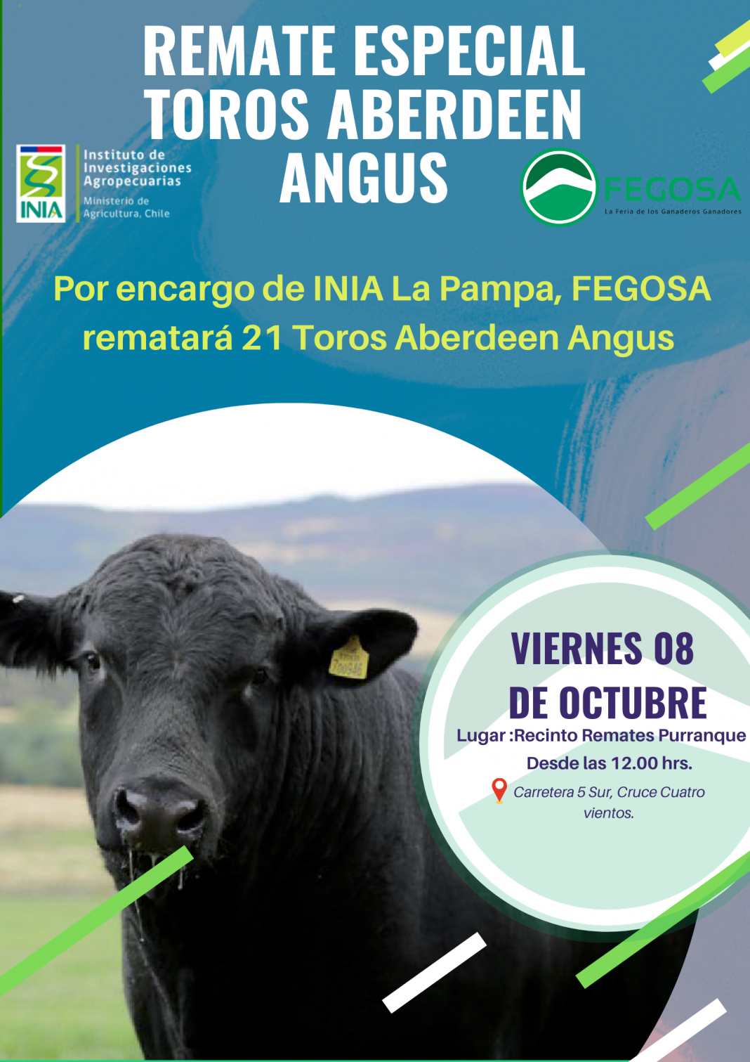 Fegosa, por encargo de INIA La Pampa, realizará el remate especial de 21 ejemplares de la fina raza de toros Aberdeen Angus. Se trata de animales generados en el criadero de bovinos del centro experimental de la entidad, situado en la comuna de Purranque, destinado a la producción de toros finos de alta calidad genética. En el catálogo en que se exhiben las características de los finos animales que serán parte del remate, el director nacional de INIA, Pedro Bustos, indicó que «con este núcleo racial especializado en carne, INIA busca proveer de toros finos de pedigrí a los productores ganaderos del país para que puedan mejorar su productividad y calidad de animales de carne con genética garantizada. Esta oferta de genética garantizada abre una interesante posibilidad de desarrollar el potencial exportador de carne bovina de la Región de Los Lagos y de todo el sur de Chile, a través de genética de alta calidad en una raza especializada, como la Aberdeen Angus, la que es reconocida por su excelente adaptación, rendimiento carnicero y calidad de carne bajo condiciones de pastoreo». El personero agregó que en cada temporada INIA selecciona animales con una mayor acumulación de información y de genes asociados a la eficiencia de conversión alimenticia, y la producción de carne de calidad en base a praderas. A ello se suma un proceso paralelo para implementar un modelo de evaluación animal, en base a registros, genómica y análisis estadístico, que permitan definir parámetros individuales de calidad genética en las condiciones de producción a pastoreo del sur de Chile y de esa manera identificar los mejores reproductores para la ganadería nacional. «Este año, nuestros toros ya son genómicos, lo que significa que sus genes fueron evaluados para los propósitos antes descritos por un panel genético internacional, lo que es una garantía más del trabajo que estamos haciendo para potenciar una producción de carne bovina nacional eficiente y acorde con los tiempos modernos» agregó Bustos, dando cuenta de la calidad de los animales que serán parte del remate. El remate se desarrollará mañana 08 de Octubre, en el recinto de la empresa situado en el Cruce Cuatro Vientos de la Ruta 5.